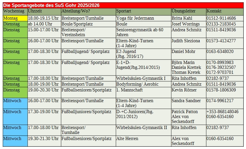 Die Yogastunden finden immer am Montag Abend um 18:00 Uhr (pünktlich!) in der Sporthalle des Grundschule in Gohr statt. Die Teilnahme ist für alle erwachsenen Vereinsmitglieder des SuS Gohr kostenlos, Interessenten können selbstverständlich 1 oder 2 mal vorbeisehen. Bitte bringt wenn möglich Eure Materialien mit (Yogamatte, Blöcke, Gurt, Decke etc.).